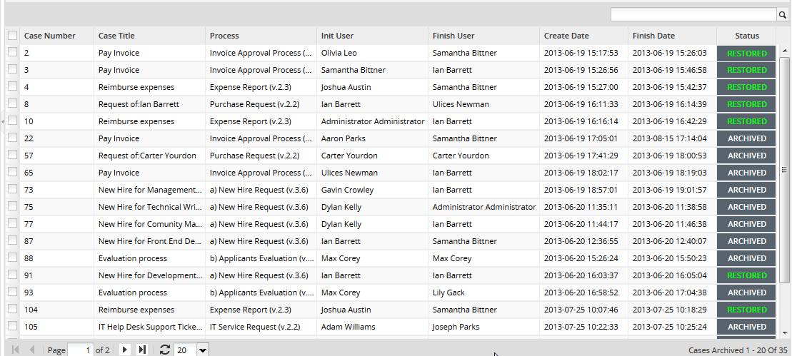 In this version, the process to unarchive cases works per page, it means, only cases selected in the current page, can be unarchived.