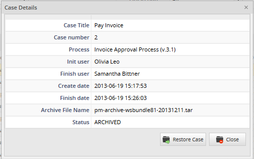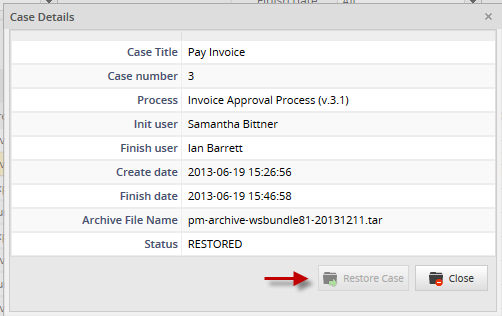 If the case is not archived, the option Restore Case will be enabled, if it is restored, the option will be disabled: