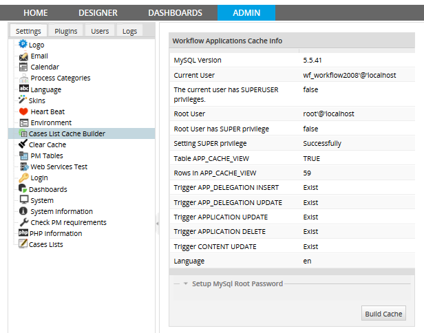 After moving the database to a new location, changing the MySQL user who has privileges to setup the ProcessMaker databases or changing the password of that user, login to ProcessMaker as the "admin" user (or any user who has the PM_SETUP_ADVANCE permission in his/her role). Then, go to HOME > Settings > Cases List Cache Builder. In the section, click on the down arrow button to expand that section.