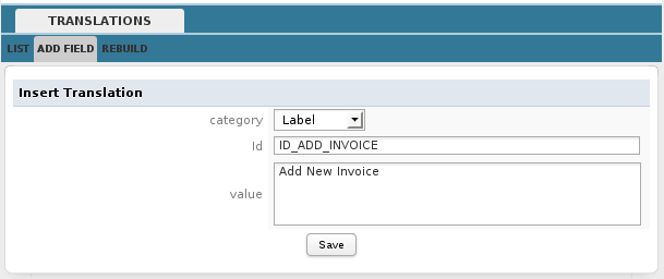 Then, go to TRANSLATIONS > ADD FIELD and define a new interface string.