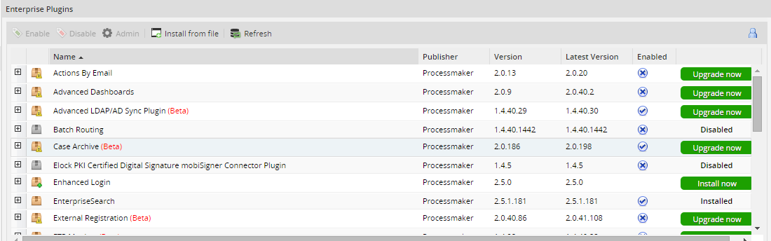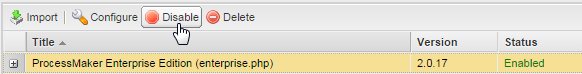 Note: If you experience any kind of problem with the Enterprice plugin, you should have to Delete the plugin.singleton file. As mentioned above, this file will be generated automatically the next time you login to ProcessMaker. Instead, if you experience any kind of problem with a Plugin inside the Enterprise Plugin, you will have to delete the "ee" file and the plugin.singleton file in order to fixed the problem. In both cases, you will have to enable the Plugin again the next time you log on to your workspace.