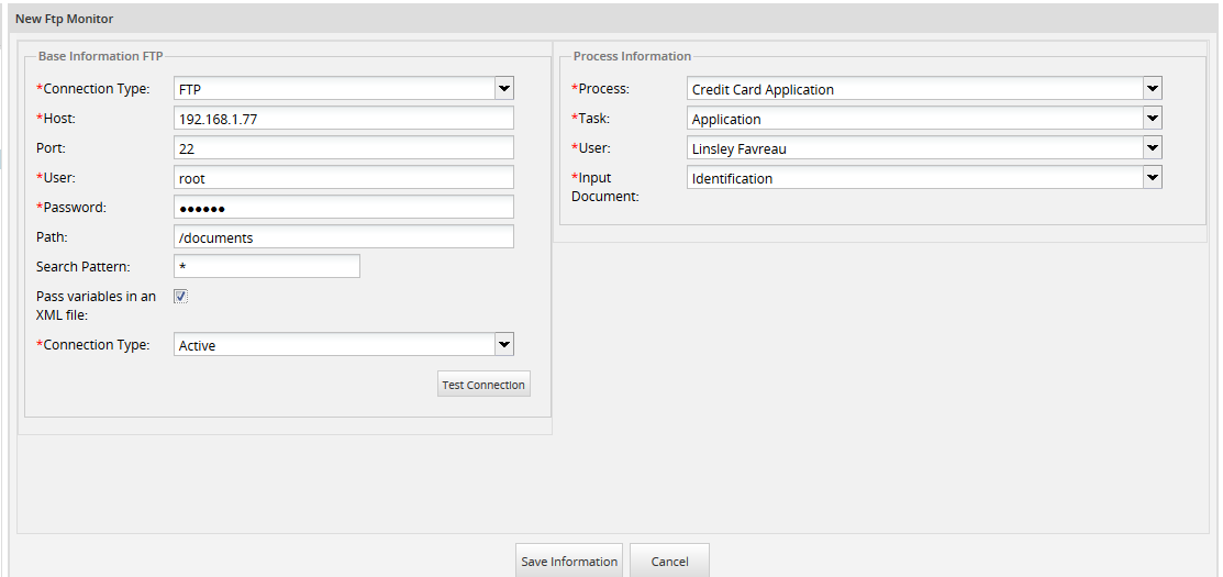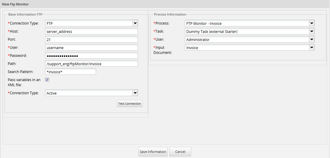 Step 3 - Create the connection: Create an FTP Monitor connection and mark the Pass variables in an XML file option and include as a search pattern *invoice* so that only files with the word "invoice" can initiate cases.