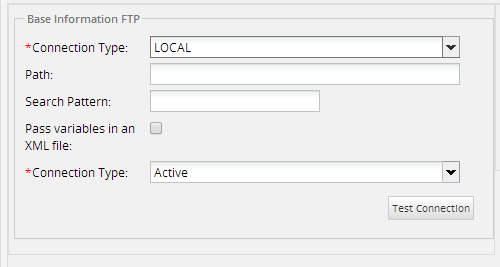 Select whether the Connection Type is FTP or SHARED (named LOCAL in version 1.4.23 and later). Depending on the selection, different properties will need to be defined.