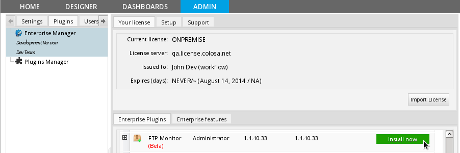 - Login with a user such as "admin" who has the PM_SETUPADVANCE permission in his/her role and then go to ADMIN > Plugins > Enterprise Manager. Either install the FTP Monitor plugin by clicking on