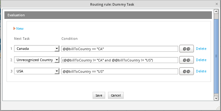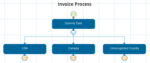 The evaluation routing rule will select whether to go to the "USA", "Canada" or "Unrecognized Country" tasks, based upon the value in the @@billToCountry case variable, which comes from the XML file.