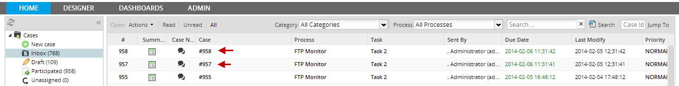 In the details output by cron.php, the two new cases are listed, along with the names of the uploaded files. Login to ProcessMaker with the user who was assigned to the two cases to see them in the Inbox:
