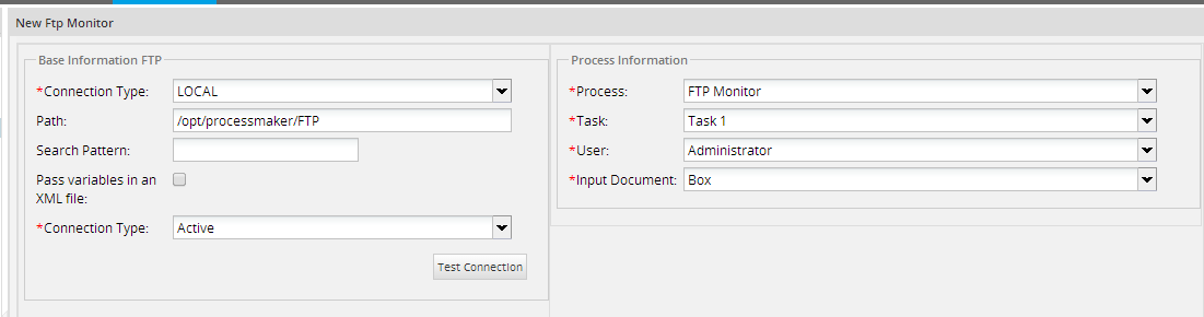 In version 1.4.23 and later, there is a new interface to define an FTP monitor connection which divides the form in two sections and provides a Test connection button to check whether the connection is correct:
