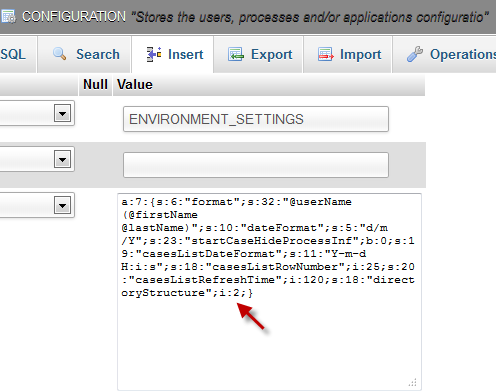 To check if a workspace is working under the new structure a flag is added inside CONFIGURATION table , go to the ProcessMaker database, look for wf_ and inside you will findCONFIGURATION table. There is a field name ENVIRONMENT_SETTINGS, when the structure is applied, directorystructure will have a value of 2, otherwise it will have a value of 1.