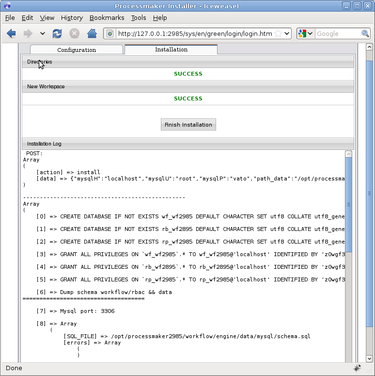 Then, click the Install button to begin installing the new databases and configuring ProcessMaker to use them.