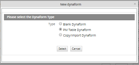 First, create a PM Table with all the fields that will be used in needed in the Dynaform. After creating the PM Table, go to PROCESS > Dynaforms to view the list of Dynaforms. Click on the New link at the top of the list to create a new Dynaform. Rather than the Blank Dynaform option, select the PM Table Dynaform option: