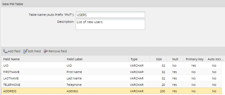 - Table Name: Enter the name of the new table, which will be converted into uppercase, because this is the name which will be used for the MySQL table. See the list of Reserved Words below to not use to name PM Tables.