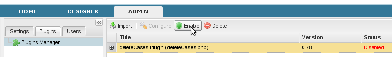 After linking or copying the plugin's files into the ProcessMaker file system, then login to ProcessMaker as the "admin" user (or another user with the PM_SETUPADVANCED permission in his/her role). Go to ADMIN > Plugins > Plugin Manager and select the new plugin which should appear in the list. Then, click on the "Enable" button to activate the plugin.