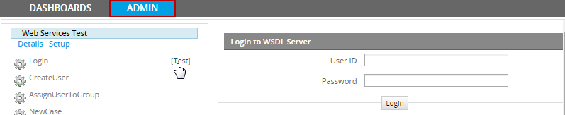 The address for WSDL web services is listed, along with the name of the ProcessMaker workspace and the session ID. A new session ID is created each time a user logins into the web services. To test whether web services is functioning and create a new session ID, click on the [Test] link for Login and enter the name of a ProcessMaker user and his/her password.