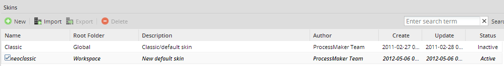To see a list of available skins installed in ProcessMaker, go to ADMIN > Settings > Skins. All available skins created for the current ProcessMaker Installation will be listed. From version 2.0 Green and Orange skins were removed form the list of available skins.