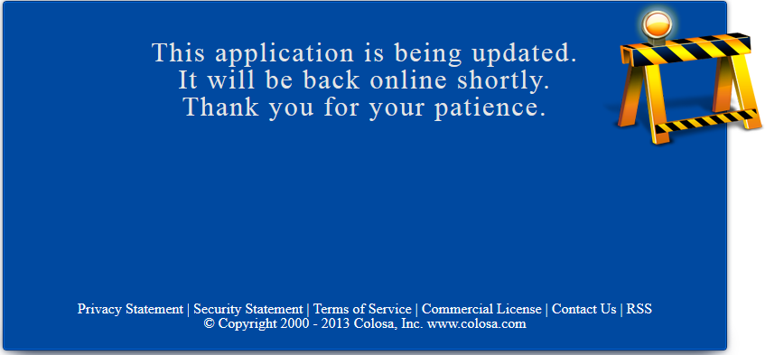If for some reasons ProcessMaker is unavailable (Upgrade, server down, etc.) users will be redirected to the following page:
