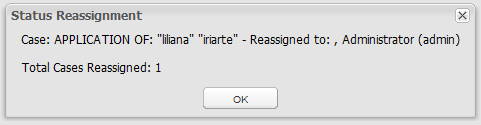The window Status Reassignment will display showing the details of the cases reassigned. Moreover, it is possible to reassign the case to the same user who has the case and who has Supervisor permissions. This is available from version 2.5.2.