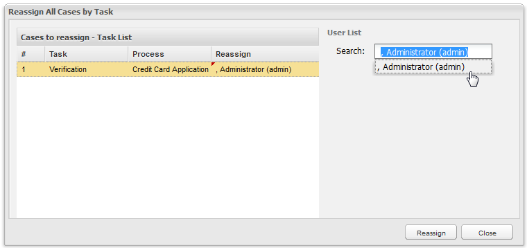 A new window will display where it is possible to reassign all cases by a task, on the right side the User List will display where the list of users available for that process will be listed, select one of the list and click on Reassign: