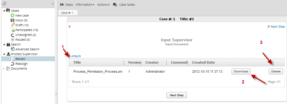 It will open a case and display the "Steps" window for a case. In that window, the supervisor can see any Input and Output Document for the case. Only the supervisor assigned as Process Supervisor will be able to see and edit those DynaForms . Meanwhile the supervisor can “see” all the Input Documents, he only will be able to “Delete” or “download” Output Documents if he is being assigned as Process Supervisor.