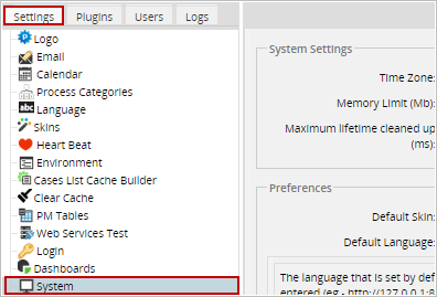The System option under the ADMIN menu is used to configure the system where ProcessMaker is installed. Only users, such the "admin", who have the PM_SETUPADVANCE permission in their role have access to this option.