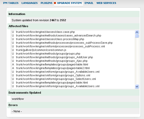 From version 1.2-2467 on, ProcessMaker will display detailed information about the upgrade: