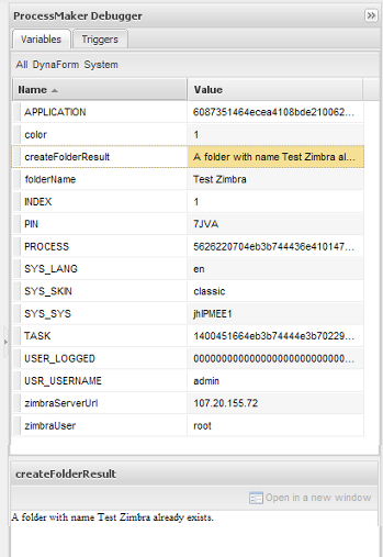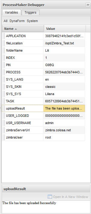 - Now, create the following Zimbra trigger, where basically once the file is uploaded by the file filed created, a temporarily path is created with the file according with the process number to finally copy the entirely temporarily path into the new path inside ProcessMaker, as it is an input document the path will be: