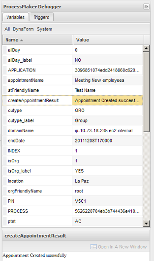 Click on Submit and in the createAppointmentResult variable you will get a message “Appointment Created Successfully”.
