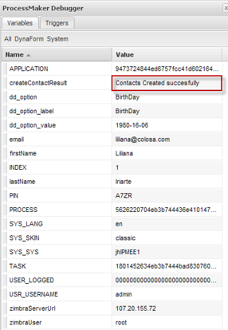 Click on Submit and in the createContactsResult variable you will get a message “Contact Created Successfully”.