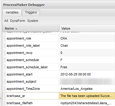 - Click on Submit and in the @@briefcase_ar variable you will get a message “The File has been uploaded successfully”.