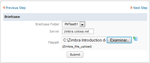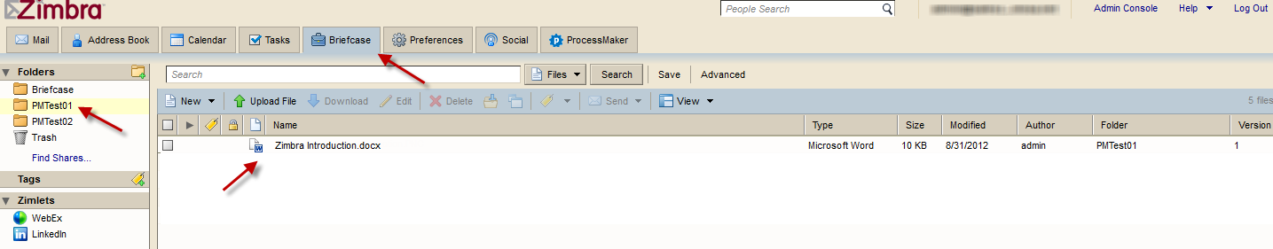 Note: If you are using Zimbra 8, briefcase is disabled by default, so it must be enabled, check this instructions to enable it.