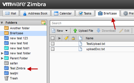 To check if the file is actually uploaded or not, login to Zimbra Webserver using the credentials and Click on Briefcase Tab and Click on the folder you provided as folder name in the trigger, you can see the file uploaded, on the Main Content Area.