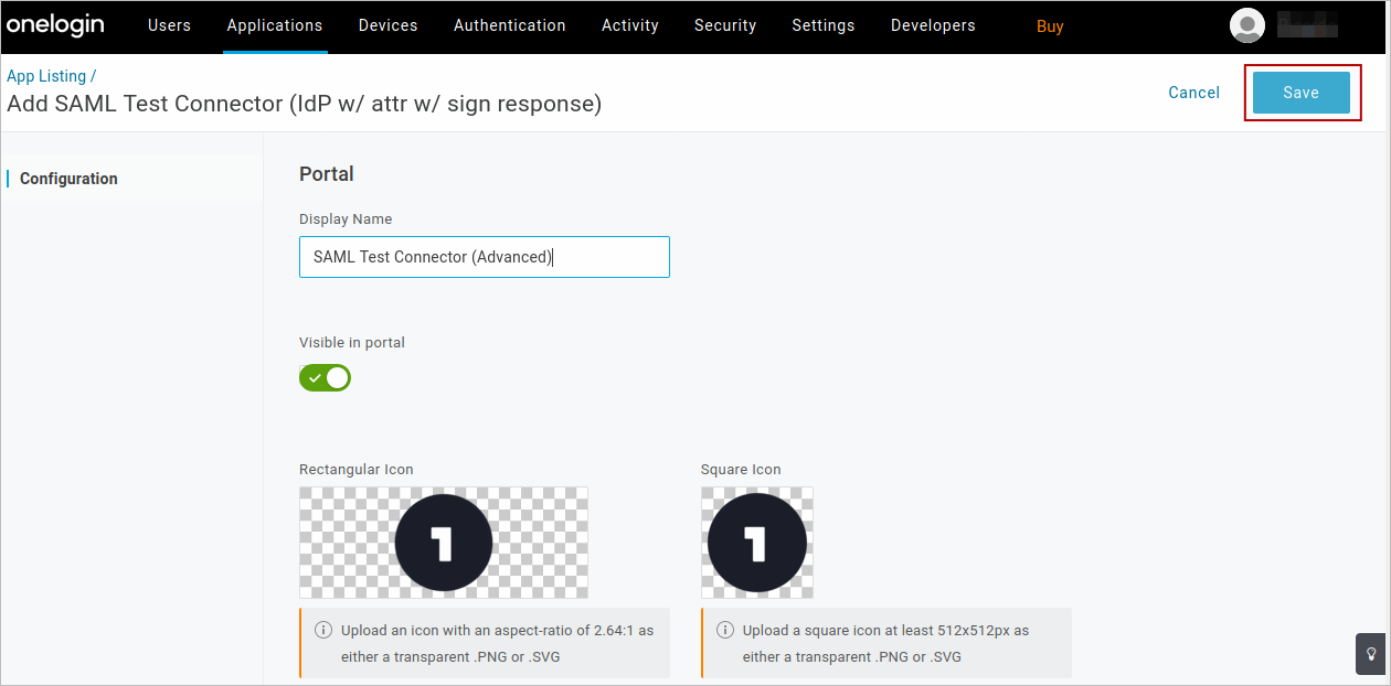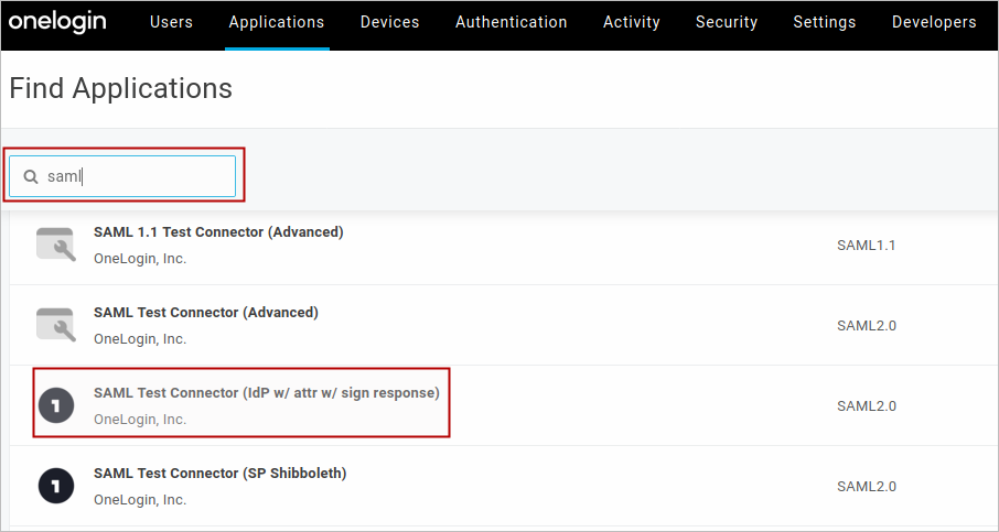 On the Find Applications page, type saml in the search... field. Select SAML Test Connector (IdP w/ attr w/ sign response).