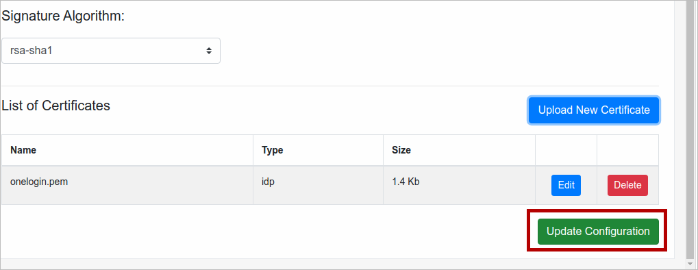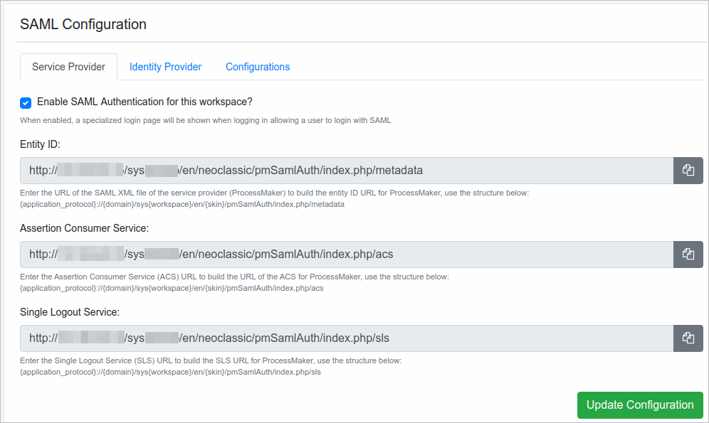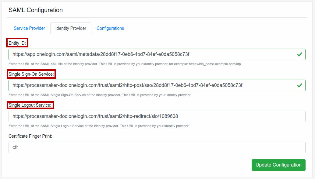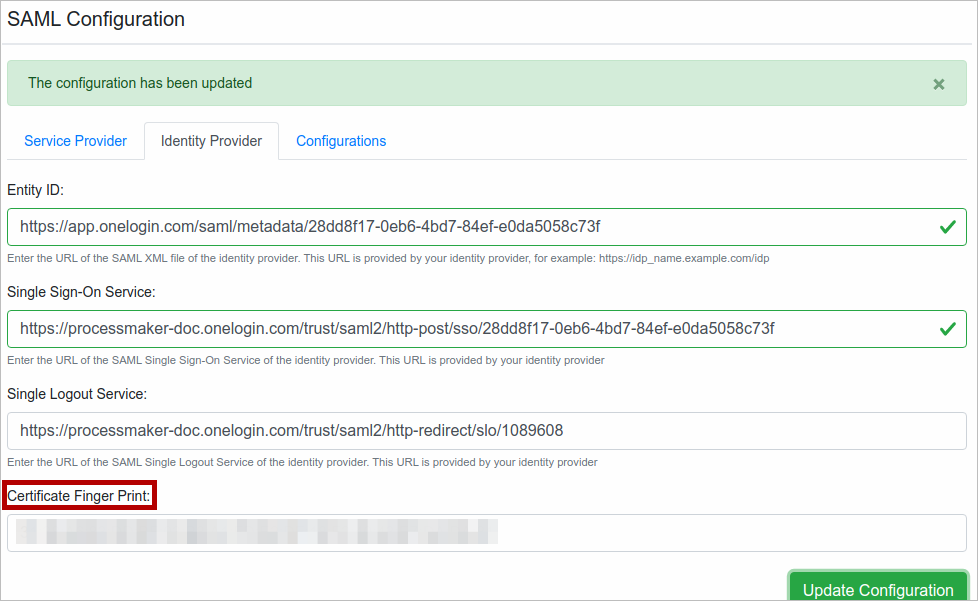Copy Fingerprint to ProcessMaker in the Identity Provider section. Click Update Configuration option.