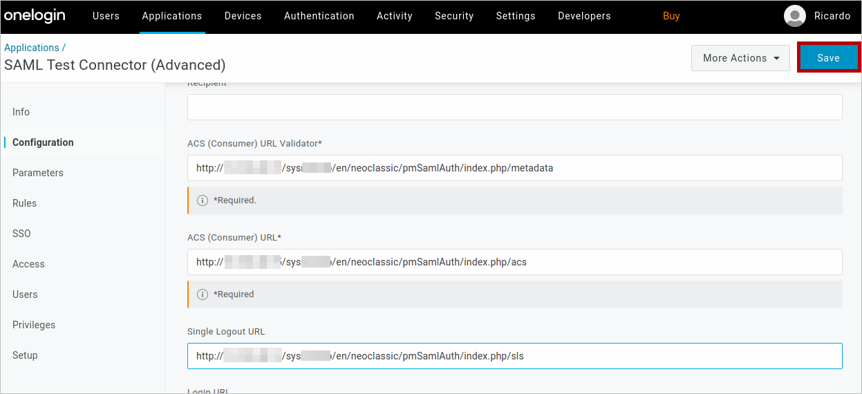 Copy the following values from ProcessMaker Service Provider section (first image below) to the Configuration section in OneLogin. Click Save: