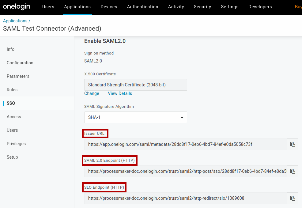 Copy the following fields from OneLogin to ProcessMaker in the Identity Provider section: