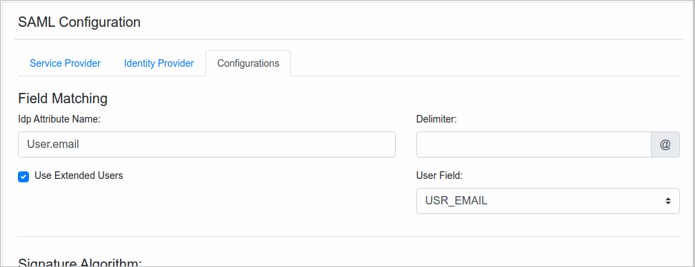 In the ProcessMaker SAML Configuration, go to Configurations and then insert the Field Matching attributes.