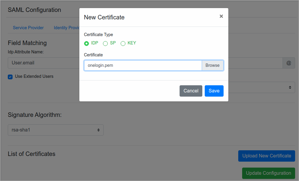 In the New Certificate pop-up screen, select IDP as the Certificate Type. Browse and then select the downloaded Certificate file. Click Save.